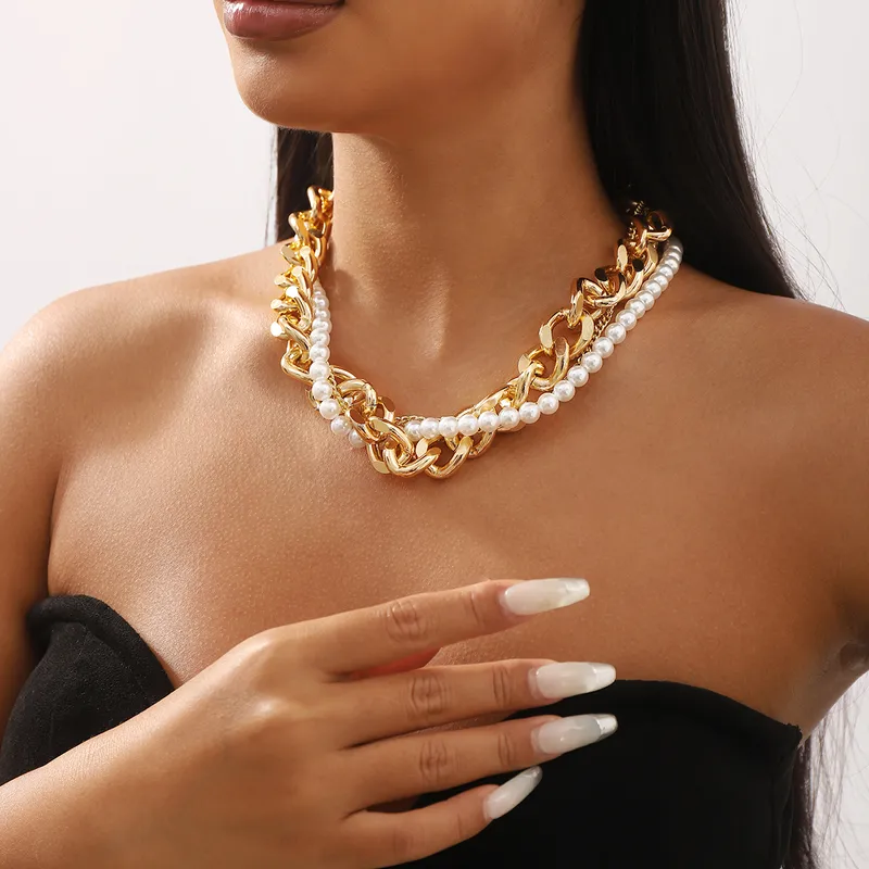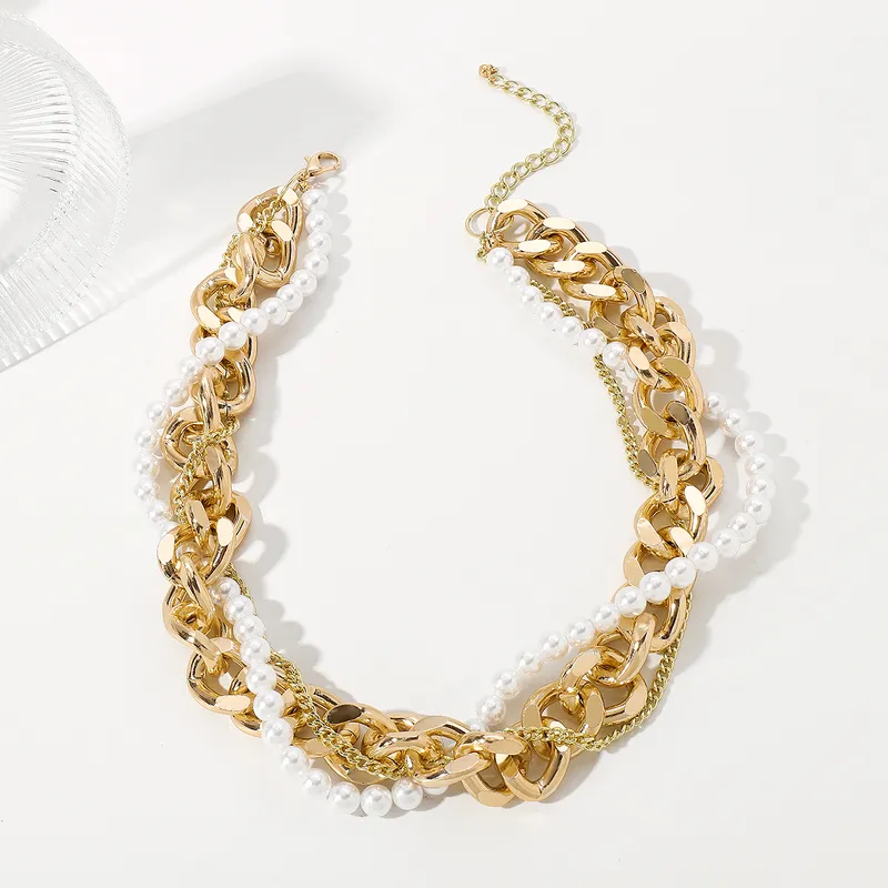 This bold necklace combines chunky gold-tone chains with elegant faux pearls for a striking layered look. Perfect for making a statement, it blends classic sophistication with modern edge, making it a versatile accessory for both casual and formal outfits.