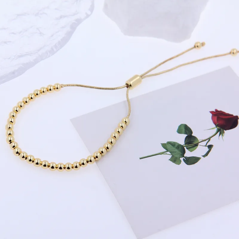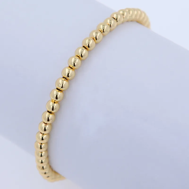 This sleek bracelet features polished gold-tone beads strung on a flexible band, offering a minimalist yet sophisticated look. Its stretch design ensures a comfortable fit, making it a perfect everyday accessory or an elegant addition to any stack.