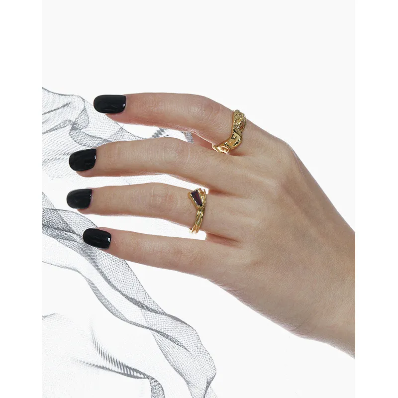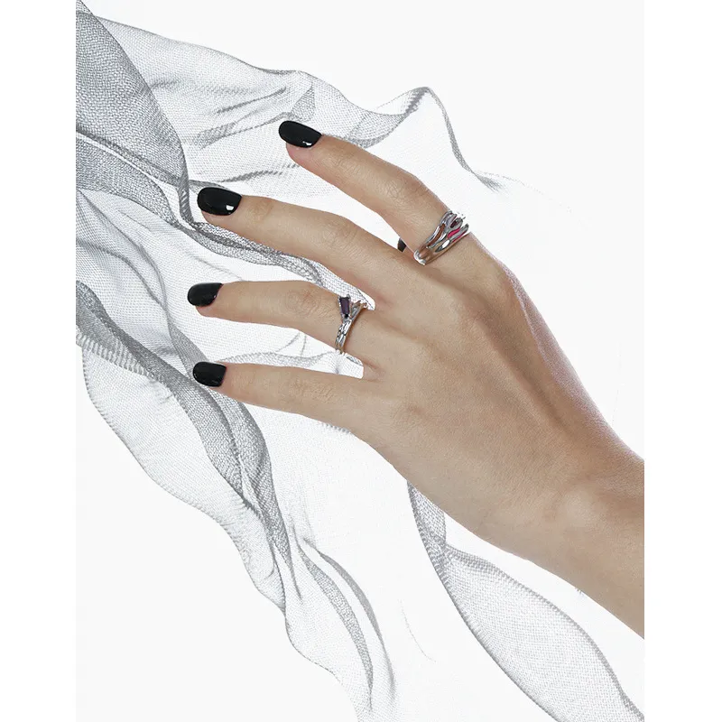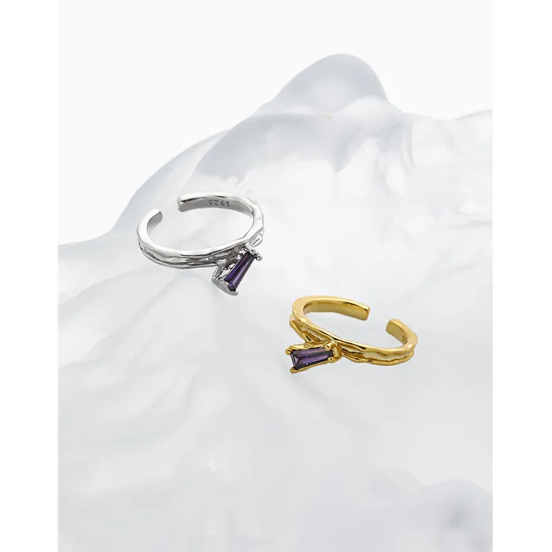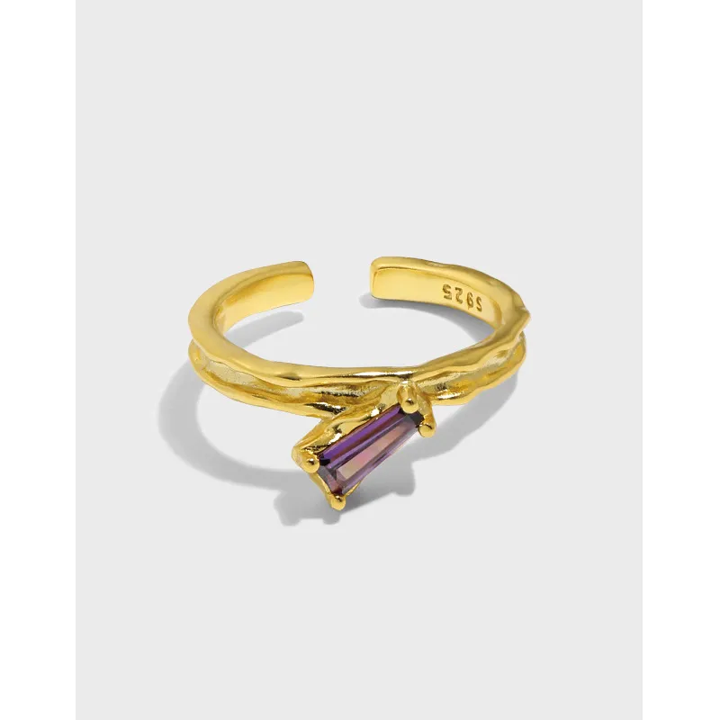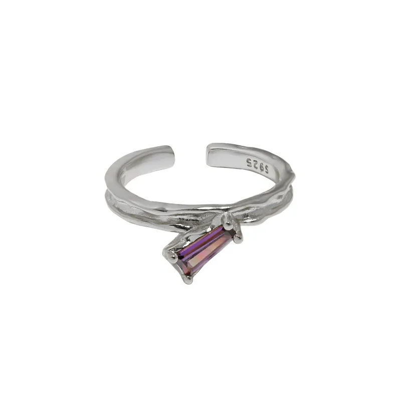 This elegant ring features a textured silver band with an open design, adorned with a sleek, baguette-cut purple stone. Its adjustable fit ensures comfort, while the unique twist design adds a touch of modern sophistication to any look.